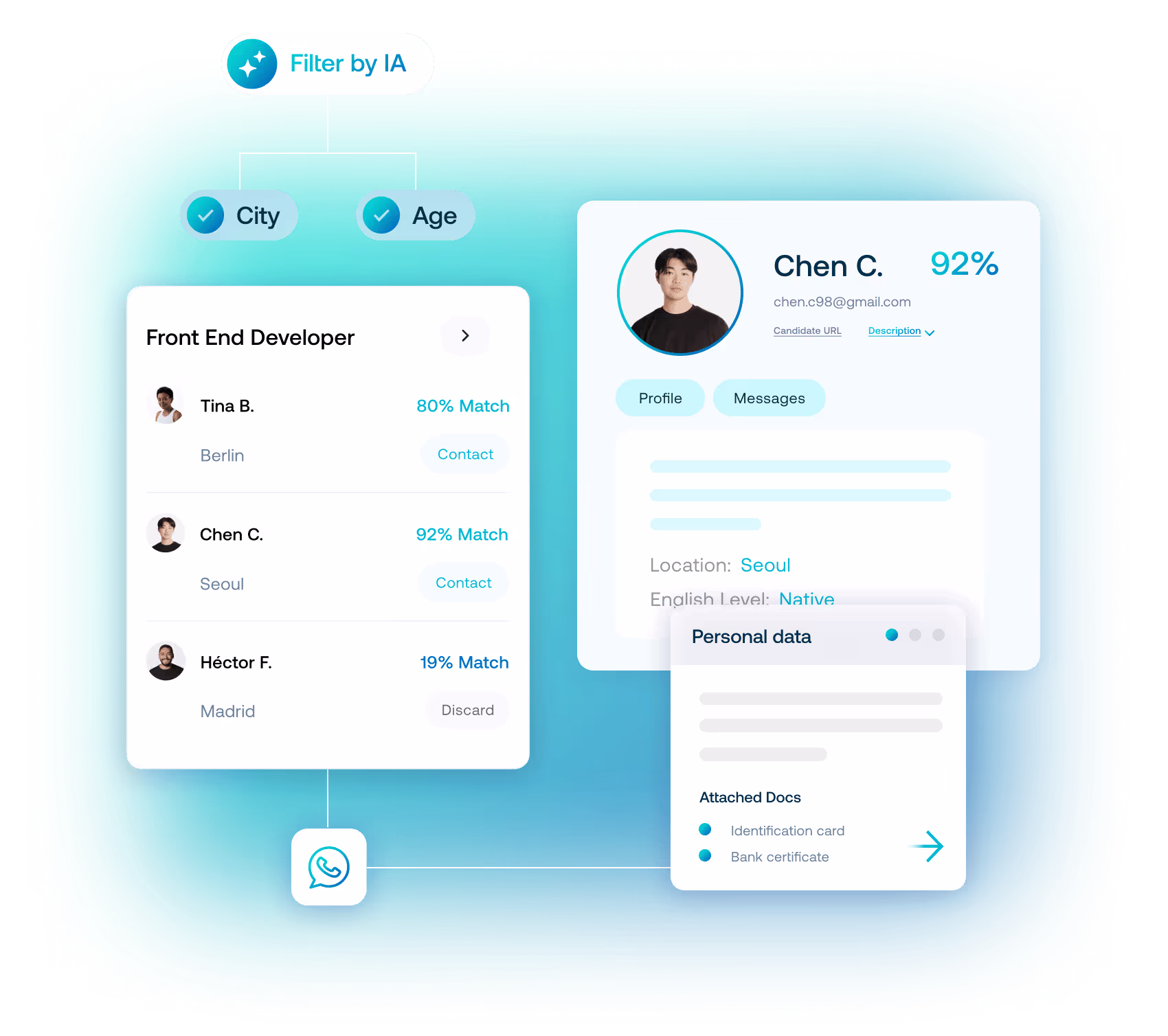 Un ATS and multilevel evaluations in the same suite. Activate the Curriculum screen automated thanks to AI with your own criteria. Design your own virtual assistants who will interview and evaluate your candidates, or incorporate video interviews with AI, evaluative tests, competencies, languages and much more!
